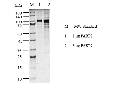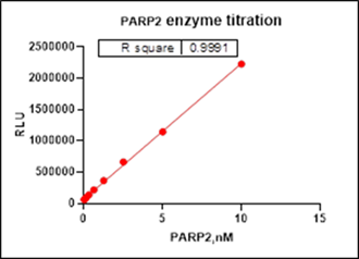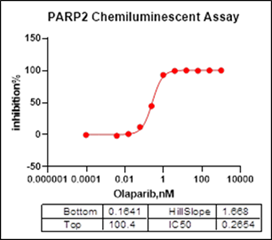 The PARP2 activity was assayed with ELISA. The reaction was performed by: 1). Histone protein was coated on a 96-well plate. 2).A biotinylated NAD+ mix is incubated with varying different concentration of the PARP2 enzyme and an activated DNA. 3).The plate was treated with streptavidin-HRP followed by addition of the ELISA ECL substrate to produce chemiluminescence. Finally, measured the signal using a chemiluminescence reader.