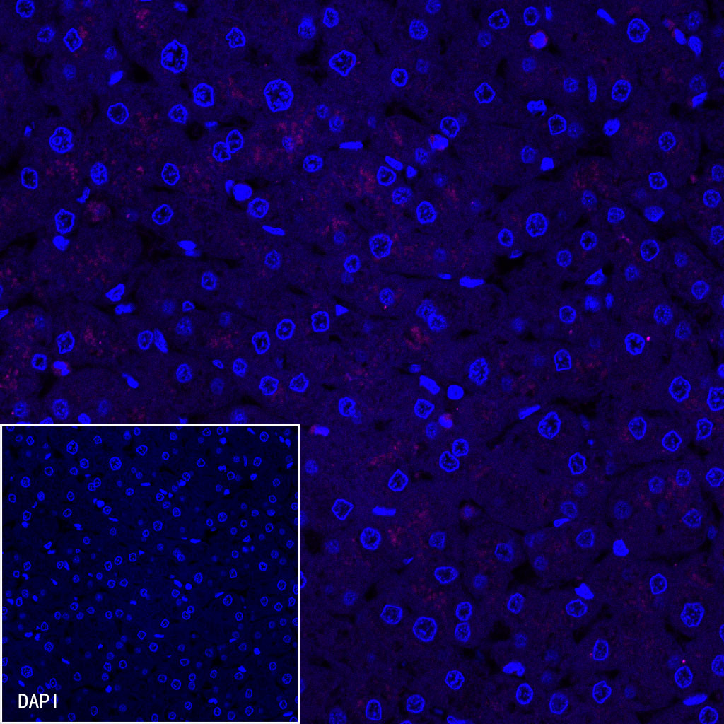 Negative control: IF shows negative staining in paraffin-embedded human liver. Anti-PD-1 antibody was used at 1/200 dilution and incubated overnight at 4°C. Goat anti-Mouse IgG(H+L) (Alexa Fluor® 647 Conjugate) (S0B4008) was used as secondary antibody at 1/500 dilution.Counterstained with DAPI (Blue). Heat mediated antigen retrieval with EDTA buffer pH9.0 was performed before commencing with IF staining protocol.