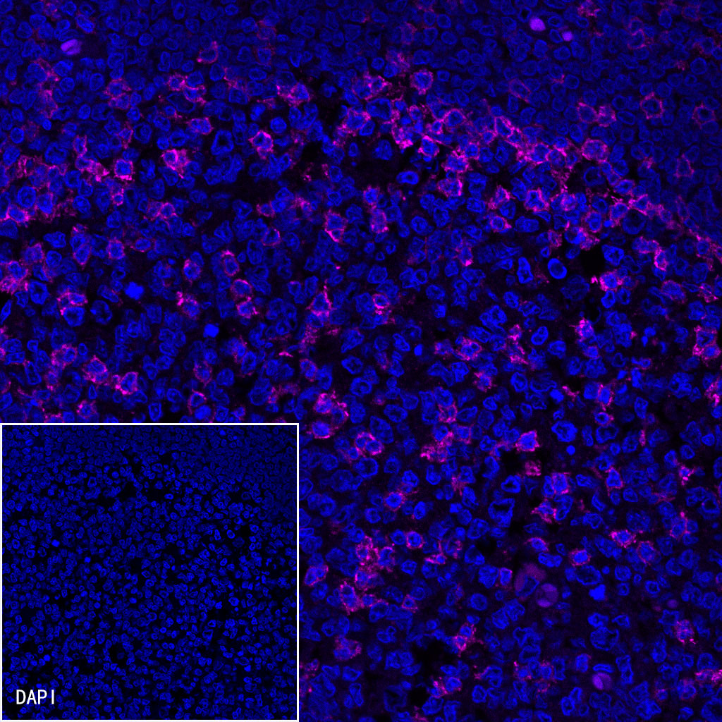 IF shows positive staining in paraffin-embedded human tonsil. Anti-PD-1 antibody was used at 1/200 dilution (magenta) and incubated overnight at 4°C. Goat anti-Mouse IgG(H+L) (Alexa Fluor® 647 Conjugate) (S0B4008) was used as secondary antibody at 1/500 dilution.Counterstained with DAPI (Blue). Heat mediated antigen retrieval with EDTA buffer pH9.0 was performed before commencing with IF staining protocol.