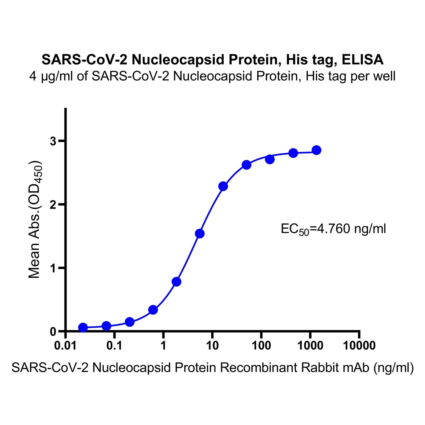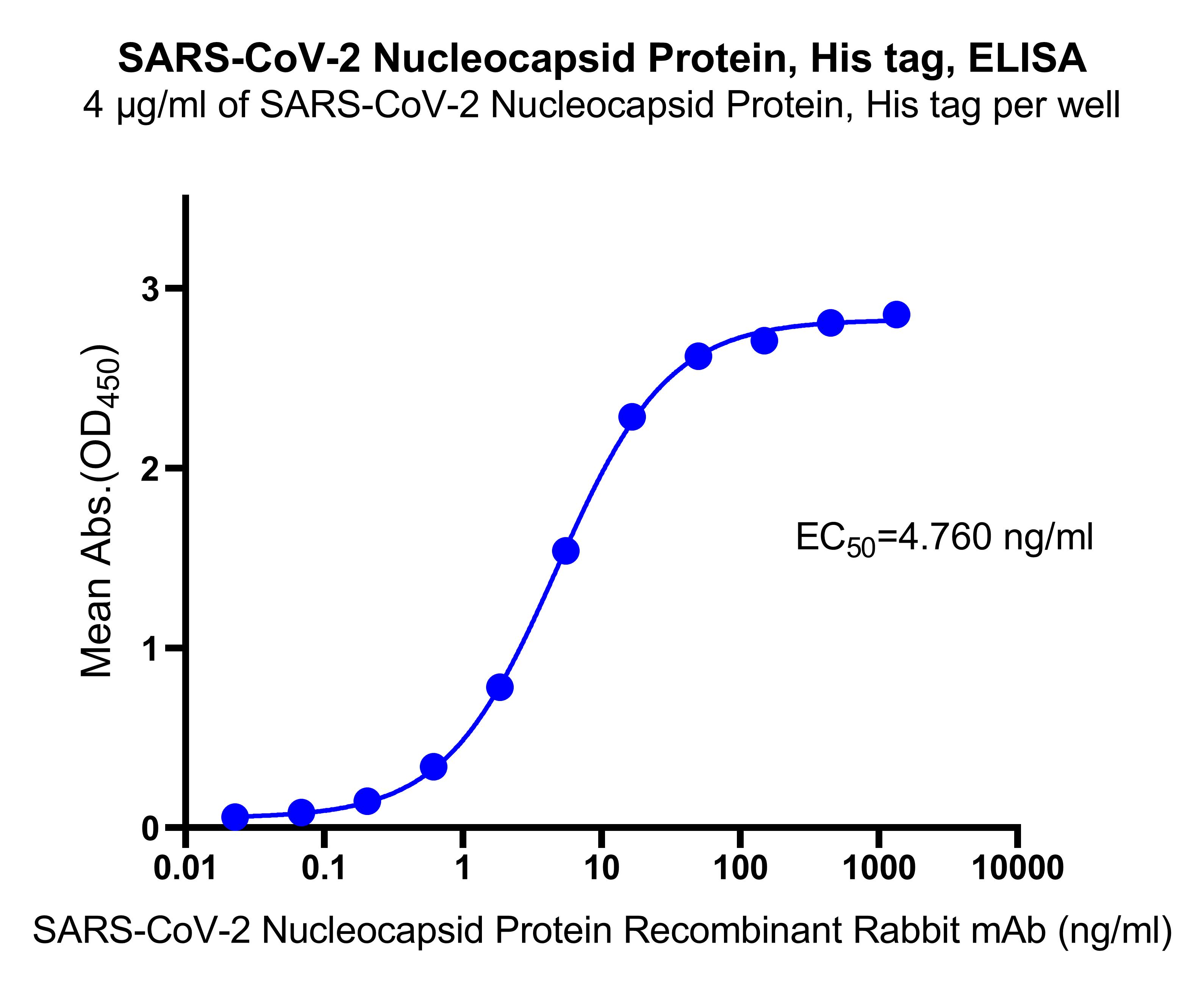 Immobilized SARS-CoV-2 Nucleocapsid protein, His tag at 4 μg/mL (50 μL/well) can bind SARS-CoV-2 Nucleocapsid Protein Recombinant Rabbit mAb (SDT-021-30) (S0B3009) with EC50 of 4.409-5.138 ng/ml.