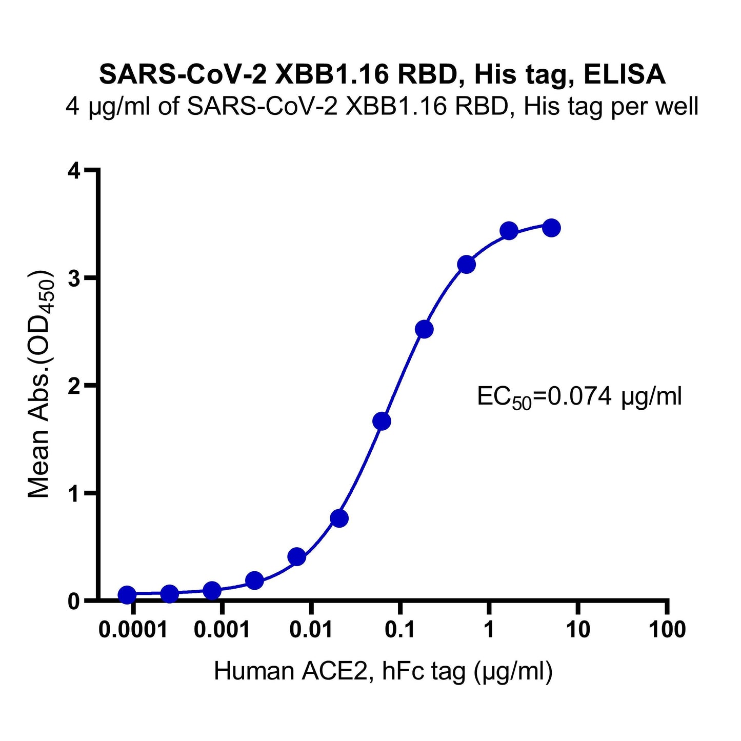 Immobilized SARS-CoV-2 XBB1.16 RBD, His tag at 4 μg/mL (50 μL/well) can bind Human ACE2, hFc tag (S0A0071) with EC50 of 0.067-0.082 μg/ml.
