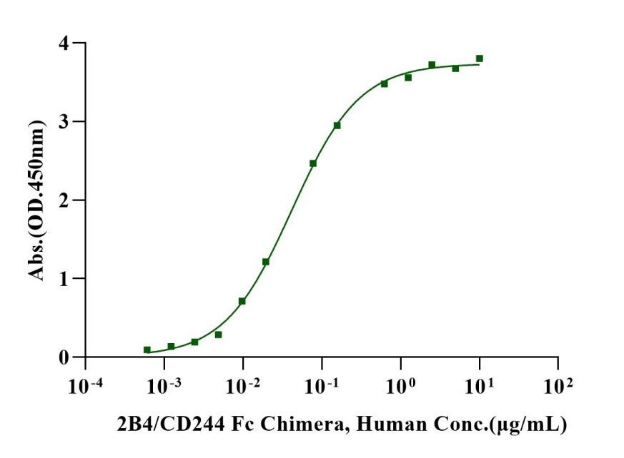 Immobilized CD48 His Tag, Human (Cat. No. UA010595) at 2.0μg/mL (100μL/well) can bind 2B4/CD244 Fc Chimera, Human(Cat. No. UA010890) with EC50 of 36.94-47.14 ng/mL.