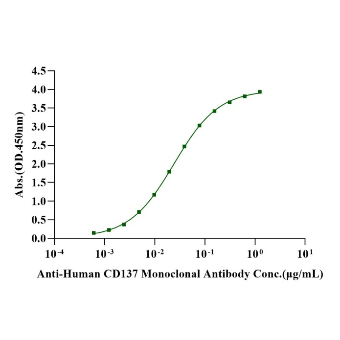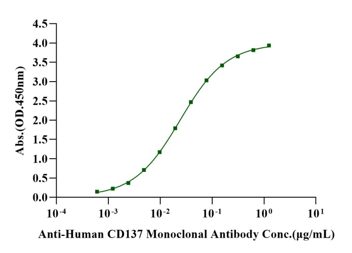 Immobilized 4-1BB/TNFRSF9 His Tag Protein, Human (Cat. No. UA010796)at 2.0μg/mL (100μL/well) can bind Anti-Human CD137 Monoclonal Antibody with EC50 of 23.19-25.51ng/mL.
