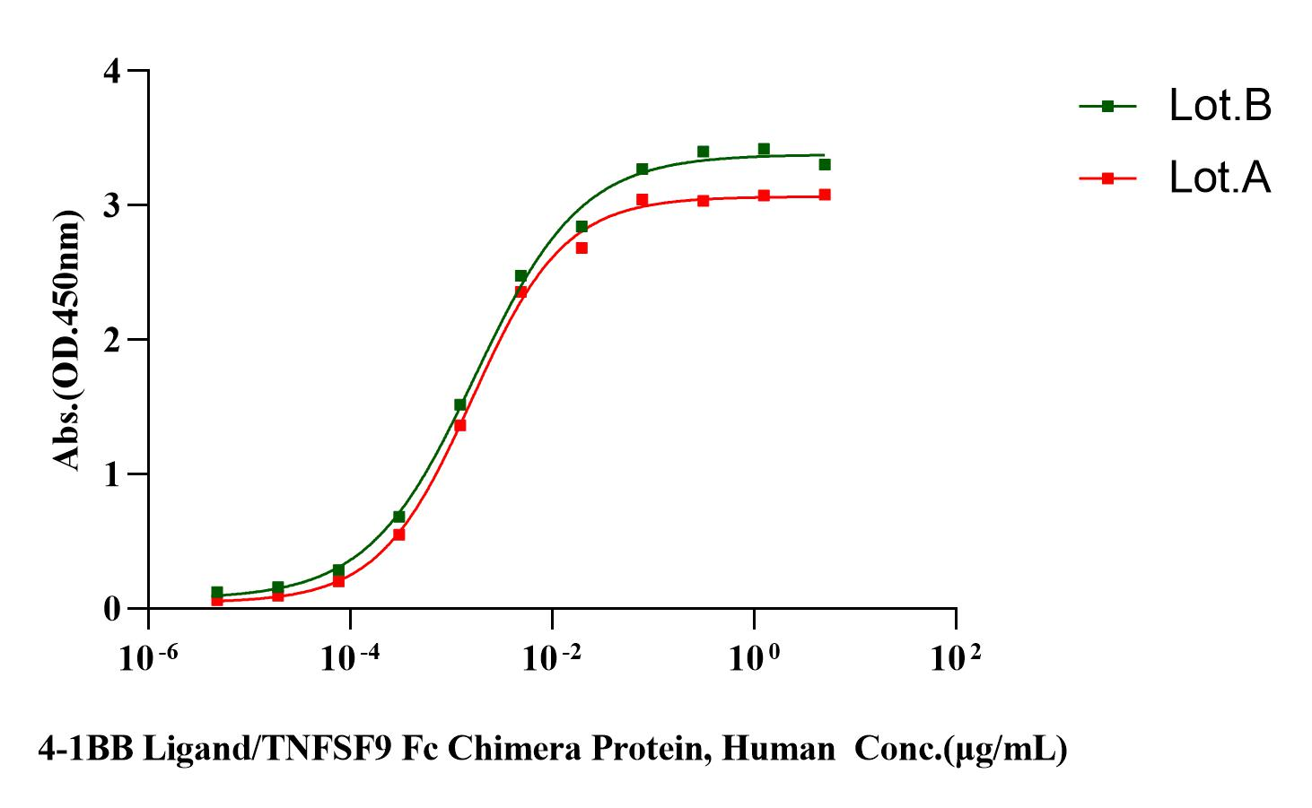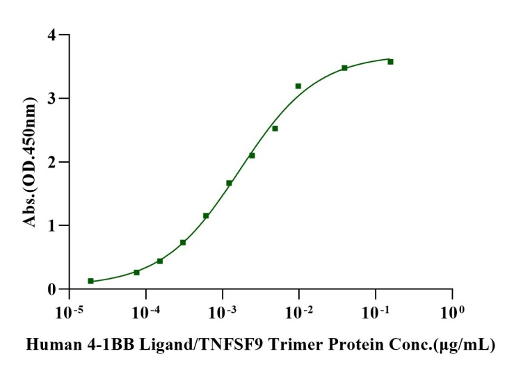 Immobilized 4-1BB/TNFRSF9 His Tag Protein, Human (Cat. No. UA010796)at 2.0μg/mL (100μL/well) can bind Human 4-1BB Ligand/TNFSF9 Trimer Protein with EC50 of 1.32-2.12ng/mL.