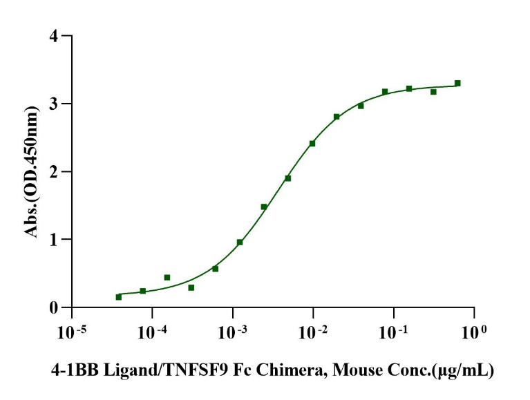Immobilized 4-1BB/TNFRSF9 His Tag Protein, Mouse(Cat. No. UA010785) at 2.0μg/mL (100μL/well) can bind 4-1BB Ligand/TNFSF9 Fc Chimera, Mouse(Cat. No. UA010783) with EC50 of 3.11-4.30 ng/ mL.
