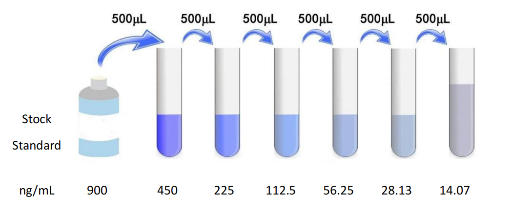 Thereafter, double dilution is carried out to 900 ng/mL , 450 ng/mL , 225 ng/mL , 112.5 ng/mL , 56.25 ng/mL , 28.13 ng/mL , 14.07 ng/mL 。 Standard dilution ( 0 ng/mL ) is a blank hole. Configure the standard according to the amount you need for later use. The configured standards are recommended in 15 Add the sample within minutes, and it is not recommended to leave it for too long.