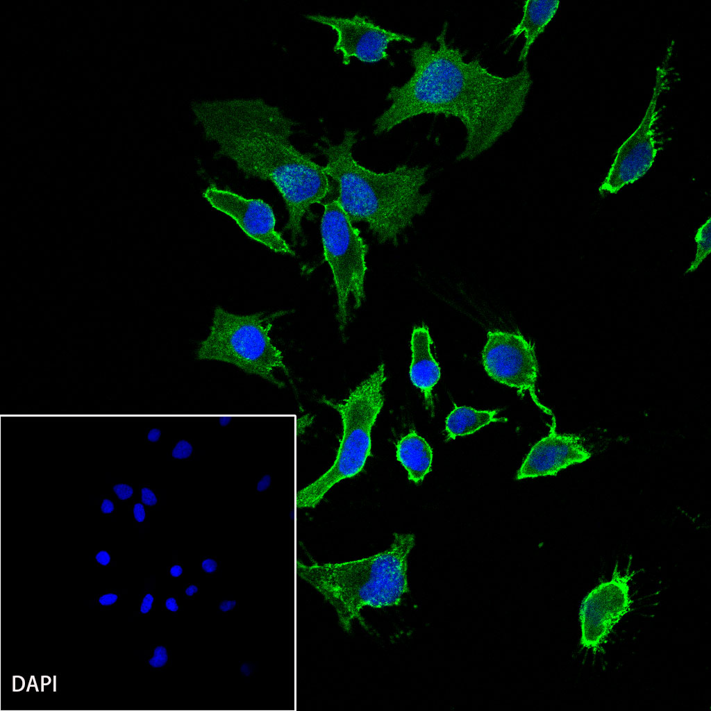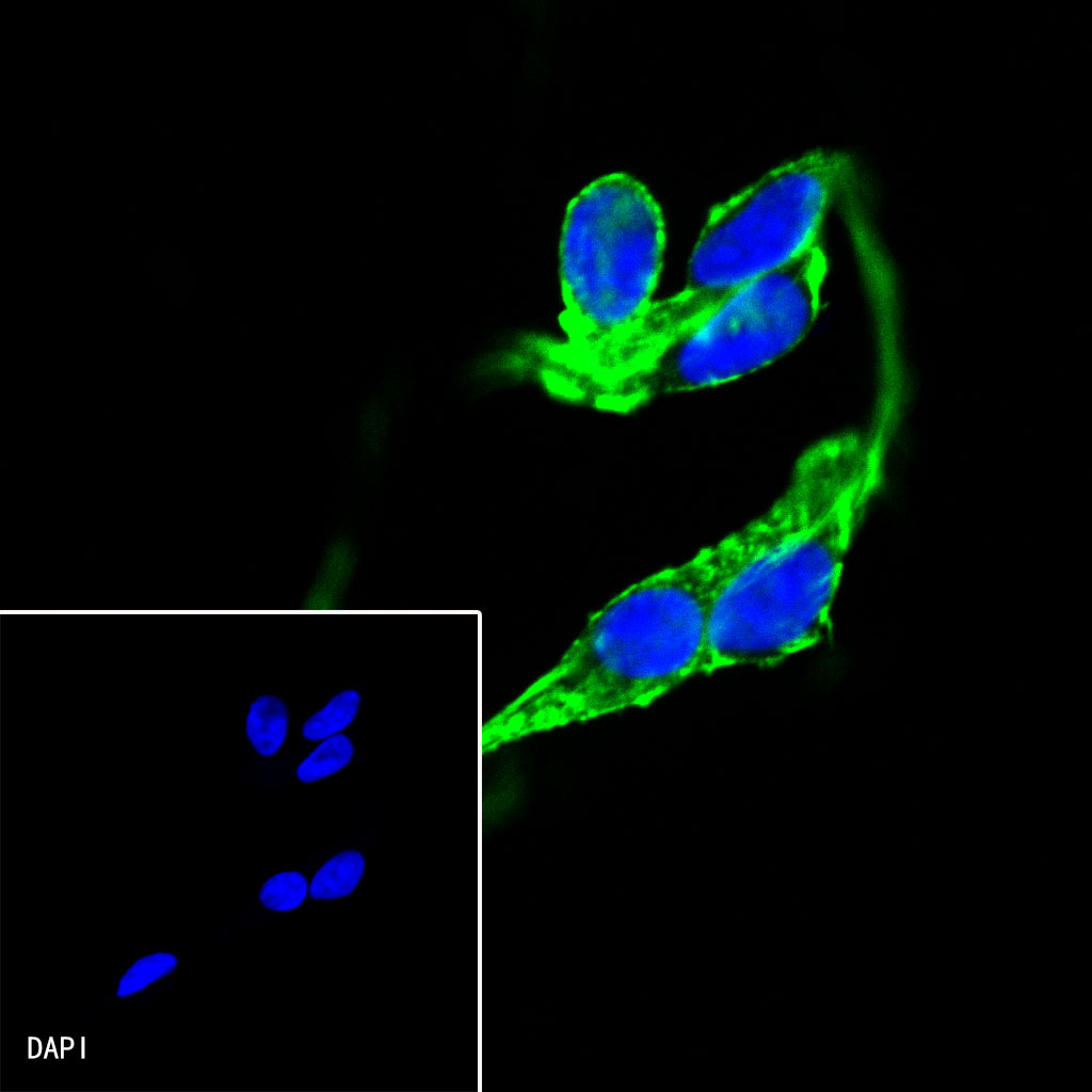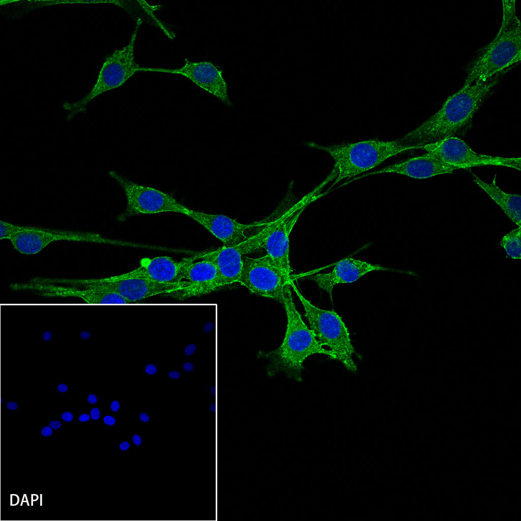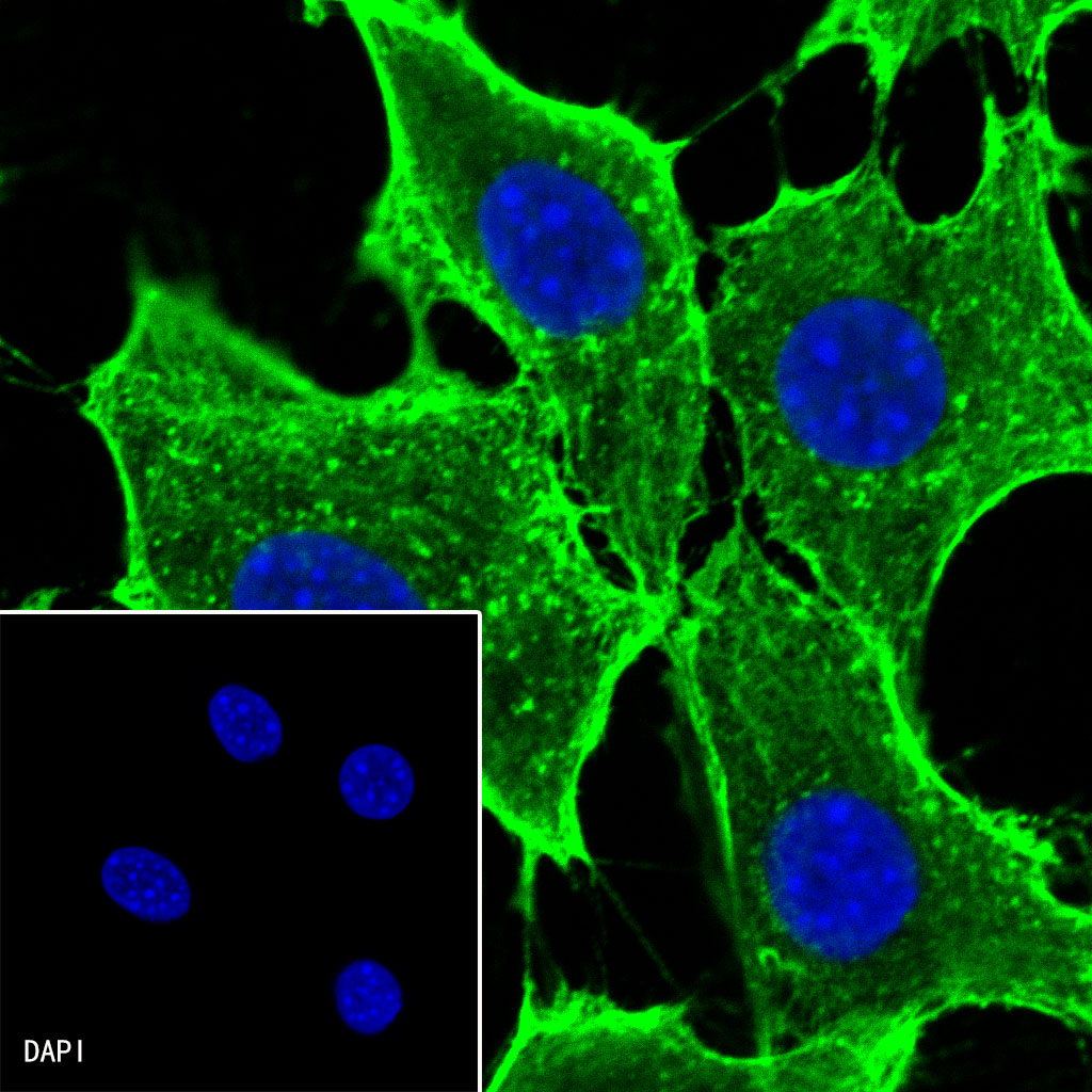 ICC shows positive staining in NIH/3T3 cells. Anti-β-actin (FITC conjugate) antibody was used at 1/100 dilution (Green) and incubated overnight at 4°C. The cells were fixed with 100% ice-cold methanol and permeabilized with 0.1% PBS-Triton X-100. Nuclei were counterstained with DAPI (Blue).