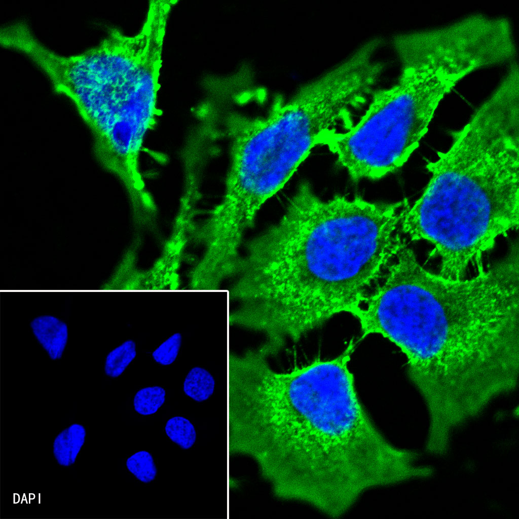 ICC shows positive staining in HeLa cells. Anti-β-actin (FITC conjugate) antibody was used at 1/100 dilution (Green) and incubated overnight at 4°C. The cells were fixed with 100% ice-cold methanol and permeabilized with 0.1% PBS-Triton X-100. Nuclei were counterstained with DAPI (Blue).