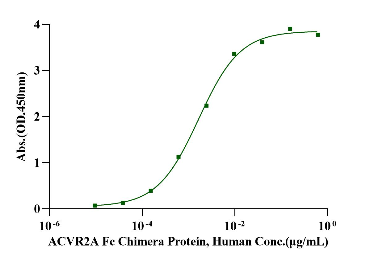 Immobilized Activin A Protein, Human/Mouse/Rat (Cat. No. UA040343) at 1.0μg/mL (100μL/well) can bind ACVR2A Fc Chimera Protein, Human (Cat. No. UA010196) with EC50 of 1.33-2.08ng/mL.