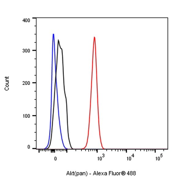 Flow cytometric analysis of 4% PFA fixed 90% methanol permeabilized Jurkat (Human T cell leukemia T lymphocyte) labelling Akt (pan) antibody at 1/500 dilution (0.1 μg)/ (Red) compared with a Rabbit monoclonal IgG (Black) isotype control and an unlabelled control (cells without incubation with primary antibody and secondary antibody) (Blue). Goat Anti - Rabbit IgG Alexa Fluor® 488 was used as the secondary antibody.