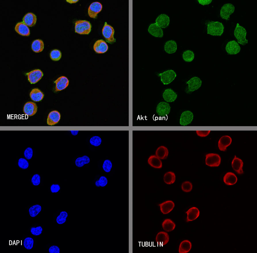 ICC shows positive staining in Jurkat cells. Anti-Akt (pan) antibody was used at 1/500 dilution (Green) and incubated overnight at 4°C. Goat polyclonal Antibody to Rabbit IgG - H&L (Alexa Fluor® 488) was used as secondary antibody at 1/1000 dilution. The cells were fixed with 4% PFA and permeabilized with 0.1% PBS-Triton X-100. Nuclei were counterstained with DAPI (Blue).Counterstain with tubulin (red).