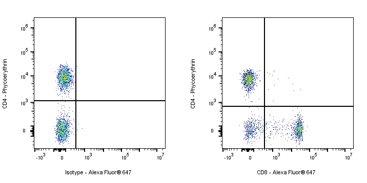 Multiparameter flow cytometric analysis of Human CD8α expression on human PBMC (human peripheral blood mononuclear cell). Human PBMC were stained with Phycoerythrin Mouse Anti-Human CD4 antibody and either Alexa Fluor® 647 Mouse IgG1, κ Isotype Control (Left panel) or SDT Alexa Fluor® 647 Mouse Anti-Human CD8α Antibody (Right panel) at 1 μg/test. Flow cytometry and data analysis were performed using BD FACSymphony™ A1 and FlowJo™ software.
