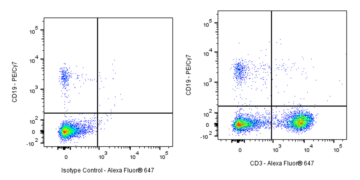 Flow cytometric analysis of Human CD3 expression on human PBMC (human peripheral blood mononuclear cell). Human PBMC were stained with PE/Cy7 Mouse Anti-Human CD19 antibody and either Alexa Fluor® 647 Mouse IgG2a, κ Isotype Control (Left panel) or SDT Alexa Fluor® 647 Mouse Anti-Human CD3 Antibody (OKT3) (Right panel) at 0.1 μg/test. Flow cytometry and data analysis were performed using BD FACSymphony™ A1 and FlowJo™ software.