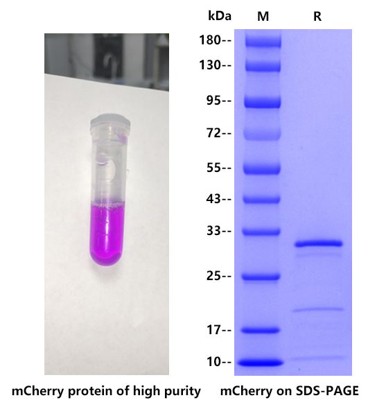 mCherry is a member of the mFruits family of monomeric red fluorescent proteins (mRFPs). mCherry absorbs light between 540-590 nm and emits light in the range of 550-650 nm. mCherry, out of all of the true monomers developed, has the longest wavelengths, the highest photostability, fastest maturation, excellent pH resistance, and is closest to mRFP1 in its excitation and emission maxima. mCherry belongs to the group of fluorescent protein chromophores used as instruments to visualize genes and analyze their functions in experiments. mCherry is used in fluorescence microscopy as an intracellular probe. It can also be used as a long-wavelength hetero-FRET (fluorescence resonant energy transfer) acceptor and probe for homo-FRET experiments.