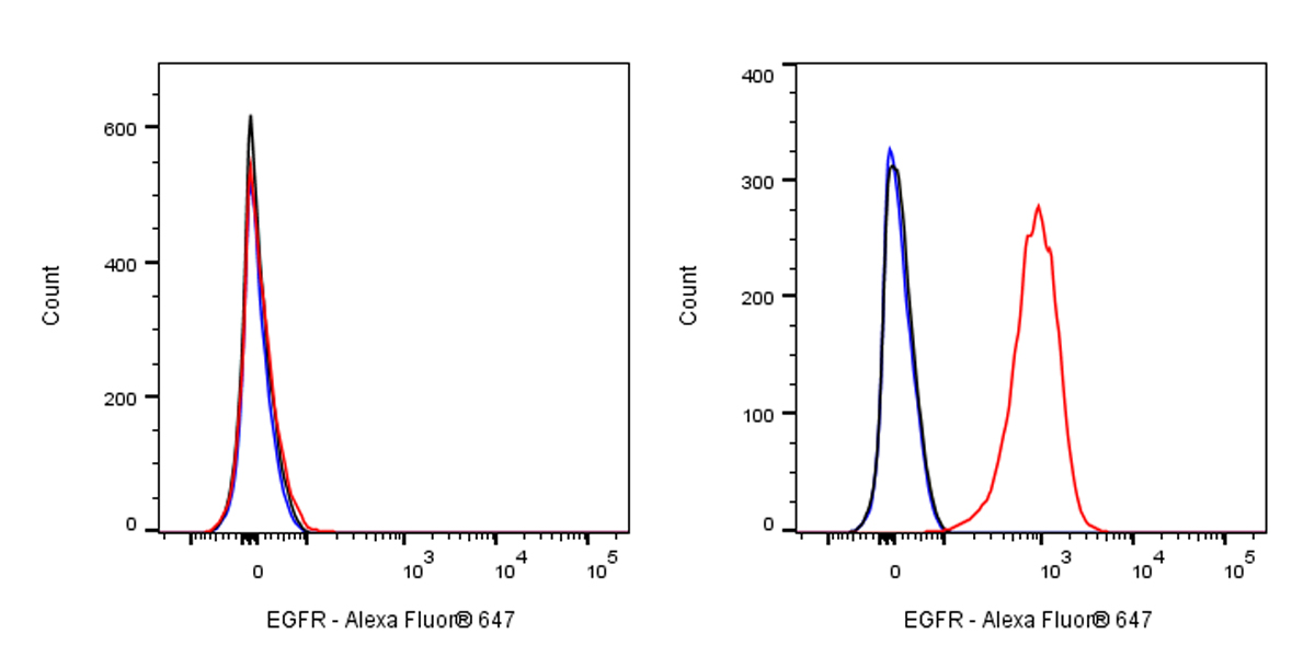 Flow cytometric analysis of MCF7 (Human breast adenocarcinoma epithelial cell, left) / A431 (Human epidermoid carcinoma epithelial cell, right) labelling EGFR antibody at 1/20000 dilution (0.01 μg) / (Red) compared with a Human monoclonal IgG (Black) isotype control and an unlabelled control (cells without incubation with primary antibody and secondary antibody) (Blue). Goat Anti - Human IgG Alexa Fluor® 647 was used as the secondary antibody. Negative control: MCF7