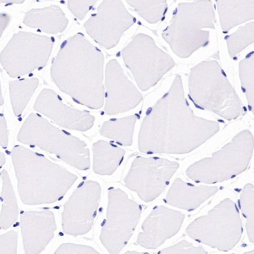 Negative control: IHC shows negative staining in paraffin-embedded human skeletal muscle. Anti-Claudin18.2 (S0B2069) antibody was used at 1/500 dilution (prepared with S0D0001), followed by a HRP Polymer for Mouse & Rabbit IgG (ready to use). Counterstained with hematoxylin. Heat mediated antigen retrieval with Tris/EDTA buffer pH9.0 was performed before commencing with IHC staining protocol.