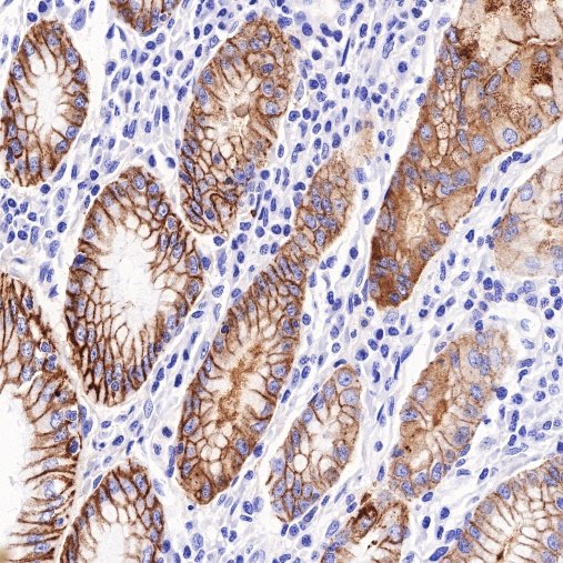 IHC shows positive staining in paraffin-embedded human stomach. Anti-Claudin18.2 (S0B2069) antibody was used at 1/500 dilution (prepared with S0D0001), followed by a HRP Polymer for Mouse & Rabbit IgG (ready to use). Counterstained with hematoxylin. Heat mediated antigen retrieval with Tris/EDTA buffer pH9.0 was performed before commencing with IHC staining protocol.