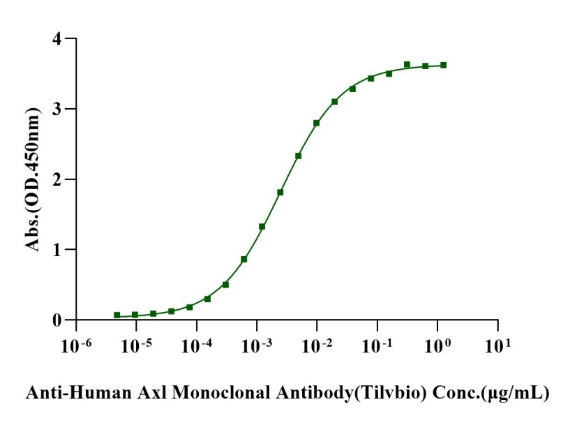 Immobilized Axl His Tag, Human (Cat. No. UA010237) at 2.0μg/mL (100μL/well) can bind Anti-Human Axl Monoclonal Antibody(Tilvbio) with EC50 of 2.36-2.62 ng/mL.