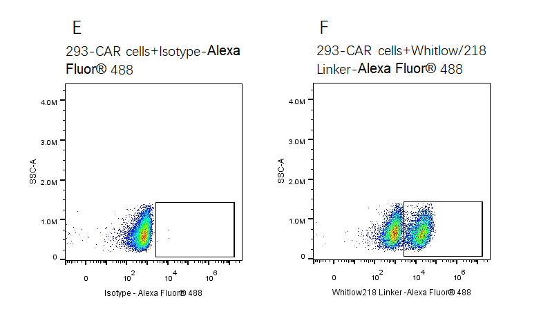 2e5 of transient transfected anti- BCMA ScFv CAR-293 cells were stained with isotype and Whitlow/218 Linker-Alexa Fluor® 488 (Fig. E and F). Alexa Fluor® 488 signal was used to evaluate the binding activity.