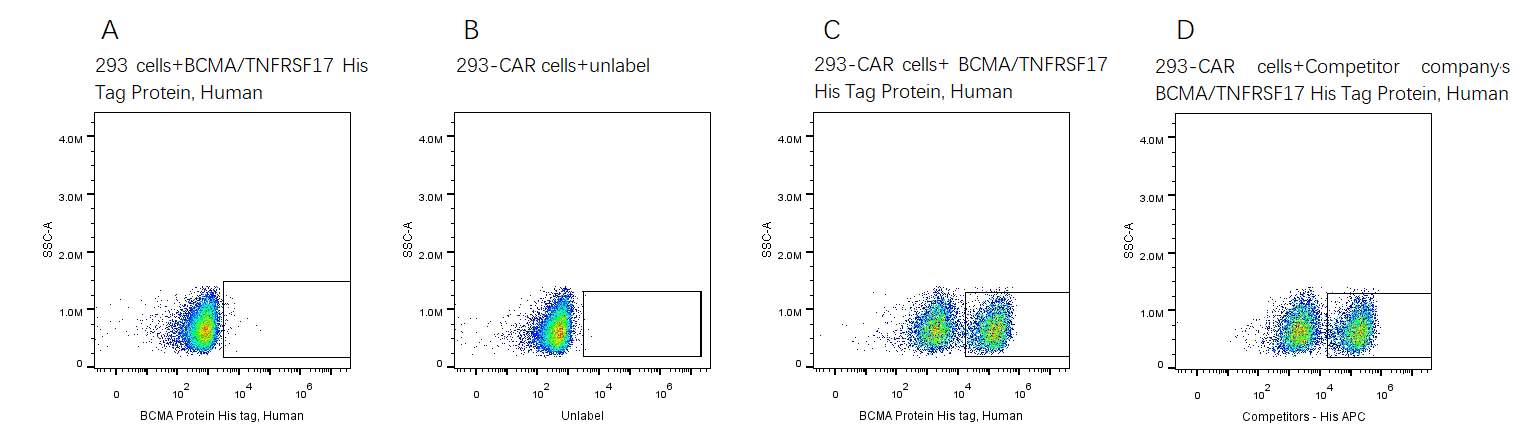 2e5 of transient transfected anti-BCMA ScFv CAR-293 cells were stained with 0.1ug BCMA His Tag Protein, Human, (Cat. No. UA010083) and unlable respectively (Fig. C and B), and non-transfected 293 cells were used as a control (Fig. A). Alexa Fluor 647 signal was used to evaluate the binding activity. 2e5 of transient transfected anti- BCMA ScFv CAR-293 cells were stained with competitor respectively (Fig.D). APC signal was used to evaluate the binding activity.