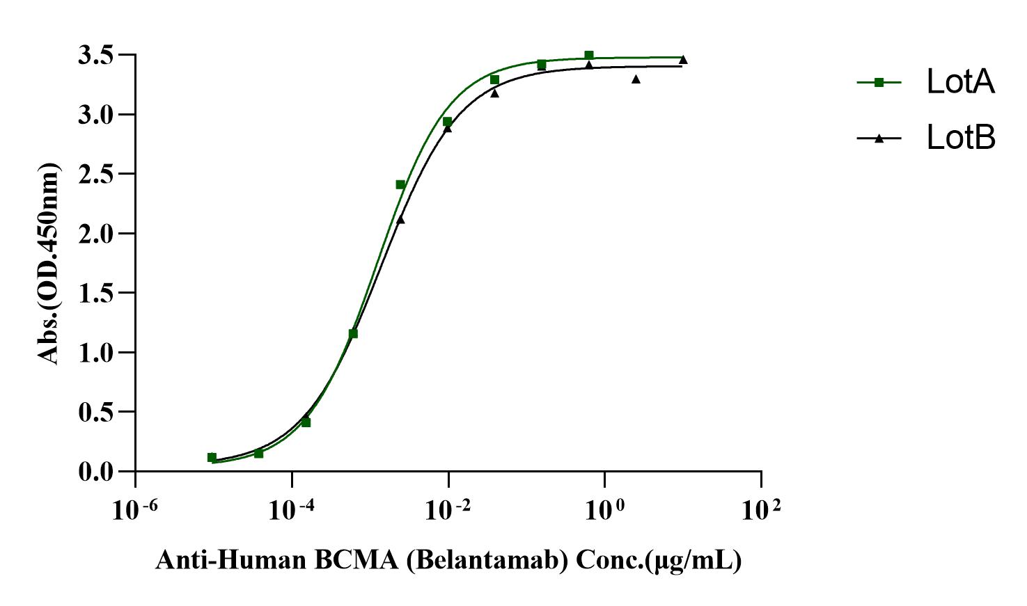 Immobilized BCMA/TNFRSF17 His Tag Protein, Human (Cat. No. UA010083) at 2.0μg/mL (100μL/well) can bind Anti-Human BCMA (Belantamab), LotA with EC50 of 1.00-1.55ng/mL. LotB with EC50 of 1.15-1.66ng/mL.