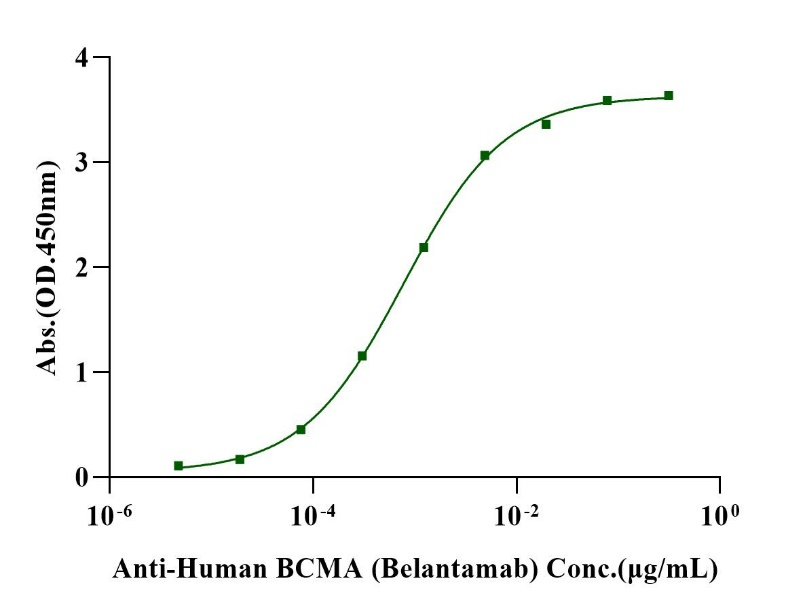 Immobilized BCMA/TNFRSF17 His Tag Protein, Human (Cat. No. UA010083) at 2.0μg/mL (100μL/well) can bind Anti-Human BCMA (Belantamab) with EC50 of 0.68-0.88ng/mL.