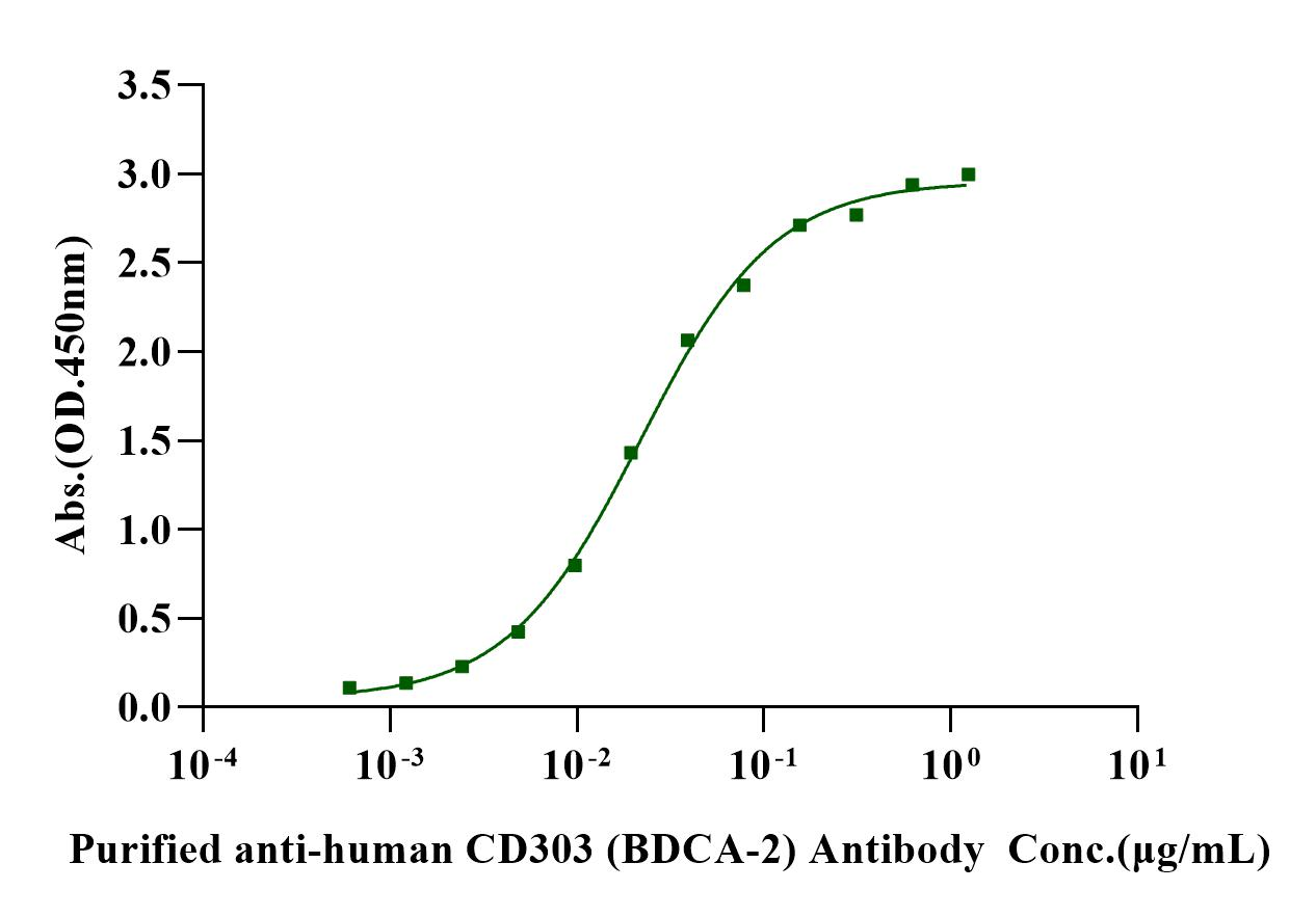 Immobilized BDCA-2/DLEC Fc Chimera Protein, Cynomolgus (Cat. No. UA011105) at 2.0μg/mL (100μL/well) can bind Purified anti-human CD303 (BDCA-2) Antibody with EC50 of 19.31-24.94 ng/mL.