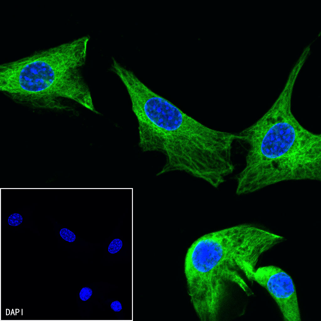 ICC shows positive staining in NIH/3T3 cells. Anti-Beta II tubulin antibody was used at 1/500 dilution (Green) and incubated overnight at 4°C. Goat polyclonal Antibody to Rabbit IgG - H&L (Alexa Fluor® 488) was used as secondary antibody at 1/1000 dilution. The cells were fixed with 4% PFA and permeabilized with 0.1% PBS-Triton X-100. Nuclei were counterstained with DAPI (Blue).