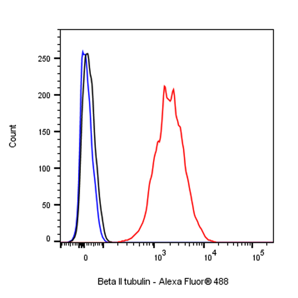 Flow cytometric analysis of 4% PFA fixed 90% methanol permeabilized HeLa (Human cervix adenocarcinoma epithelial cell) labelling Beta II tubulin antibody at 1/500 dilution (0.1 μg)/ (Red) compared with a Rabbit monoclonal IgG (Black) isotype control and an unlabelled control (cells without incubation with primary antibody and secondary antibody) (Blue). Goat Anti - Rabbit IgG Alexa Fluor® 488 was used as the secondary antibody.