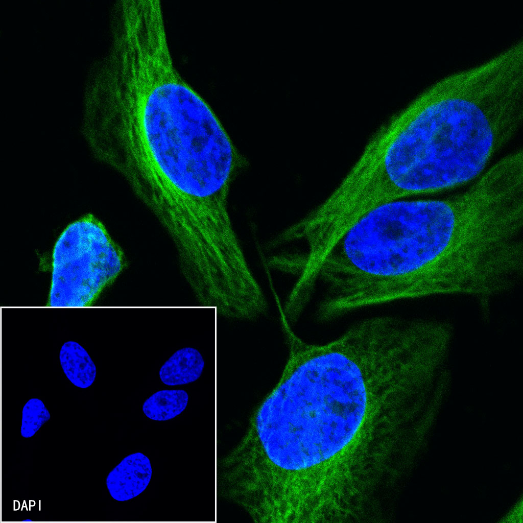 ICC shows positive staining in HeLa cells. Anti-Beta II tubulin antibody was used at 1/500 dilution (Green) and incubated overnight at 4°C. Goat polyclonal Antibody to Rabbit IgG - H&L (Alexa Fluor® 488) was used as secondary antibody at 1/1000 dilution. The cells were fixed with 4% PFA and permeabilized with 0.1% PBS-Triton X-100. Nuclei were counterstained with DAPI (Blue).