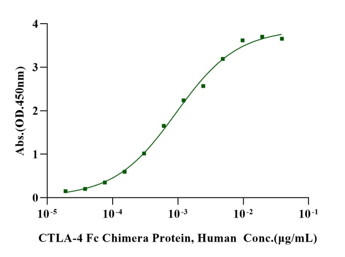 Immobilized Biotinylated B7-1 Avi&His Tag Protein, Human (Cat. No. UA010539) at 2 μg/mL on Streptavidin precoated (0.5μg/well) plate, can bind CTLA-4 Fc Chimera Protein, Human (Cat. No. UA010039) with EC50 of 0.74-1.19ng/ml.