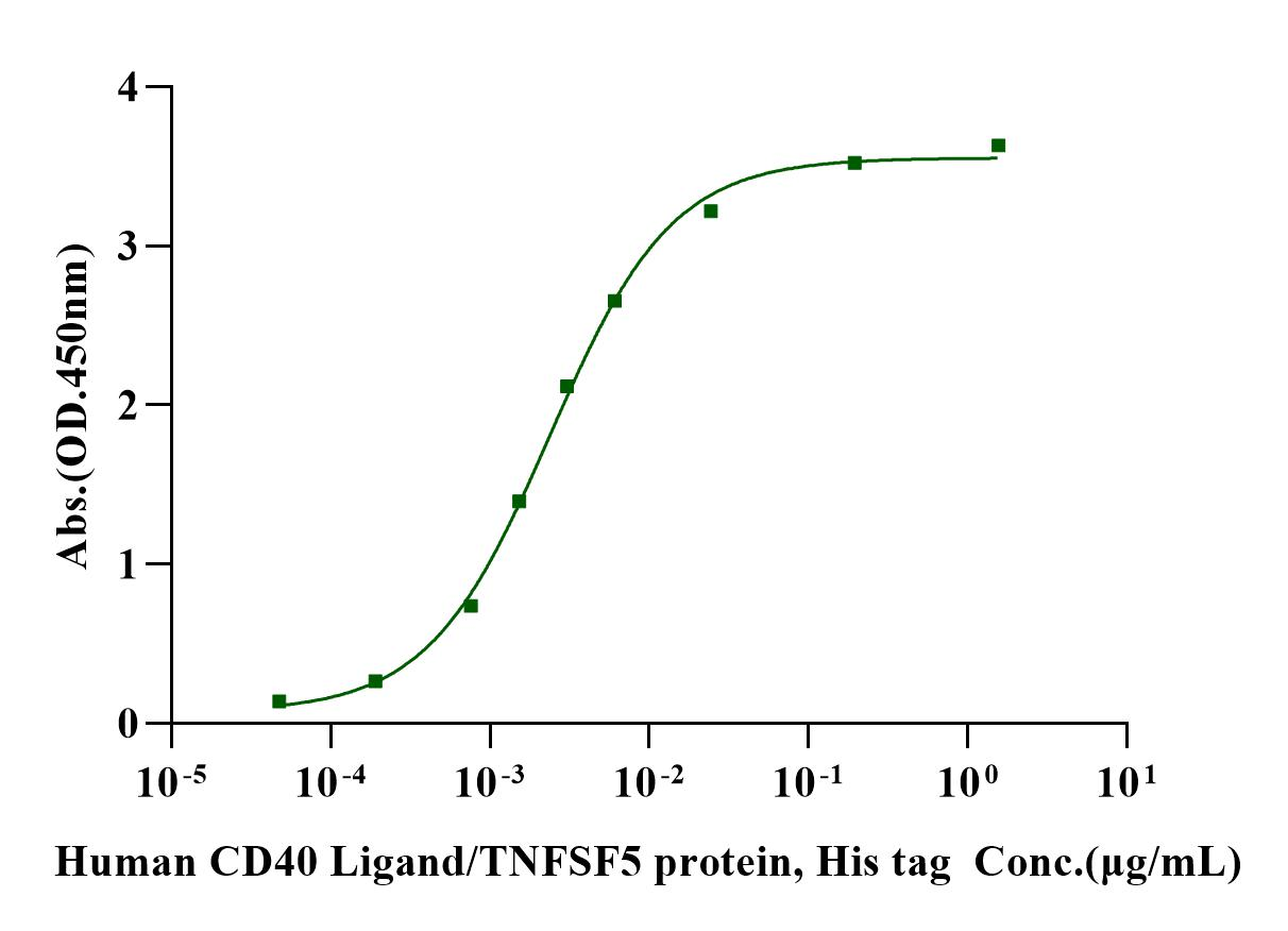 Immobilized Biotinylated CD40 Fc&Avi Tag, Human (Cat. No. UA010443) at 2 μg/mL on Streptavidin precoated (0.5μg/well) plate, can bind Human CD40 Ligand/TNFSF5 protein, His tag (Cat. No. S0A1123) with EC50 of 1.20-2.85ng/ml.