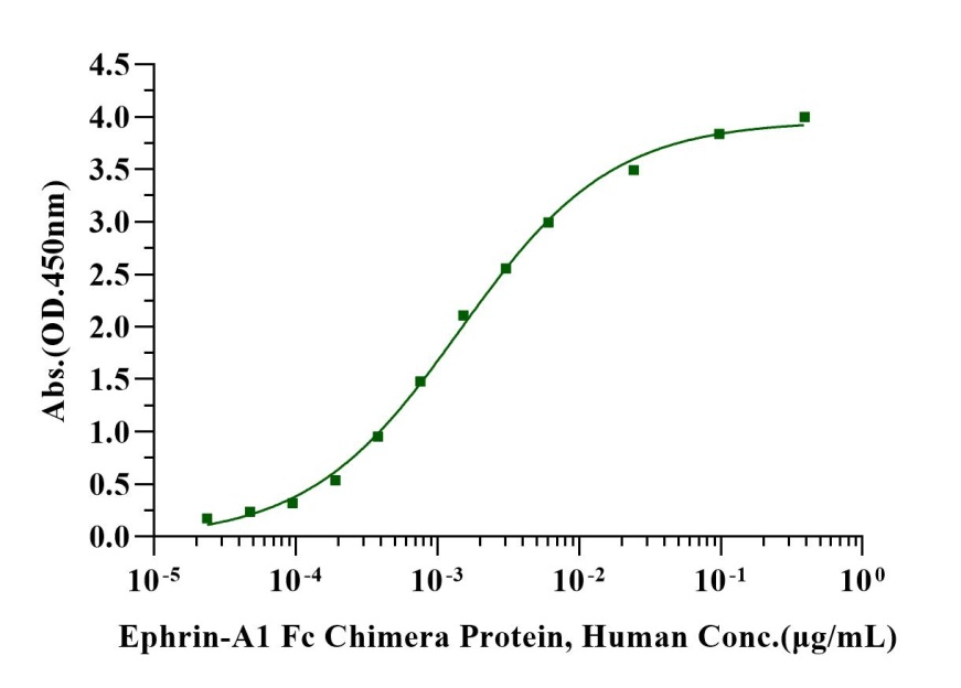 Immobilized Biotinylated EphA2 His&Avi Tag Protein, Human (Cat. No. UA010833) at 2 μg/mL on Streptavidin precoated (0.5μg/well) plate, can bind Ephrin-A1 Fc Chimera Protein, Human (Cat. No. UA011030) with EC50 of 1.20-1.74 ng/ml.
