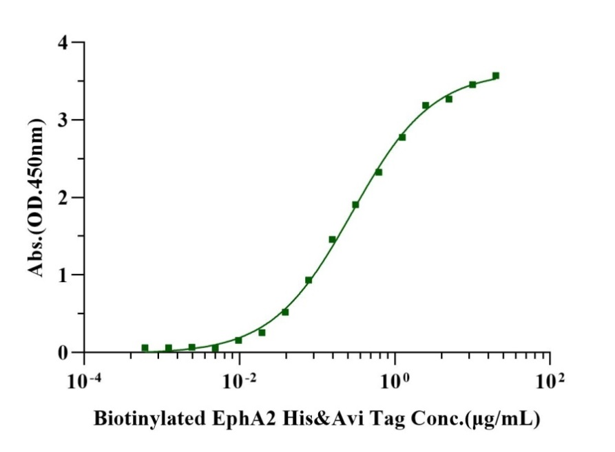 Immobilized Ephrin-A1 His Tag, Human (Cat. No. UA010170) at 2.0μg/mL (100μL/well) can bind Biotinylated EphA2 His&Avi Tag (Cat. No. UA010833) with EC50 of 0.25-0.36μg/mL .