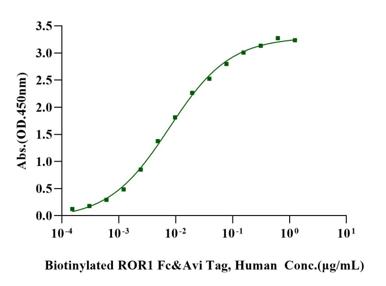 Immobilized Anti-Human ROR1 Monoclonal Antibody (Zilovertamab) at 2.0μg/mL (100μL/well) can bind Biotinylated ROR1 Fc&Avi Tag, Human(Cat. No. UA010830)with EC50 of 6.61-8.99ng/mL.
