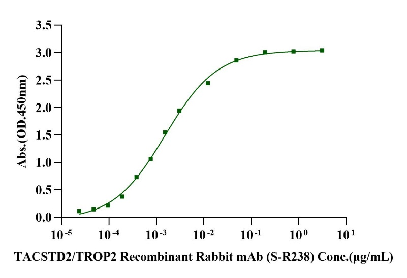 Immobilized Biotinylated TROP2/TACSTD2 His&Avi Tag Protein, Cynomolgus (Cat. No. UA010831) at 2.0μg/mL (100μL/well) on Streptavidin precoated (0.5μg/well) plate, can bind TACSTD2/TROP2 Recombinant Rabbit mAb (S-R238) (Cat. No. S0B0324)with EC50 of 1.30-1.80ng/mL.