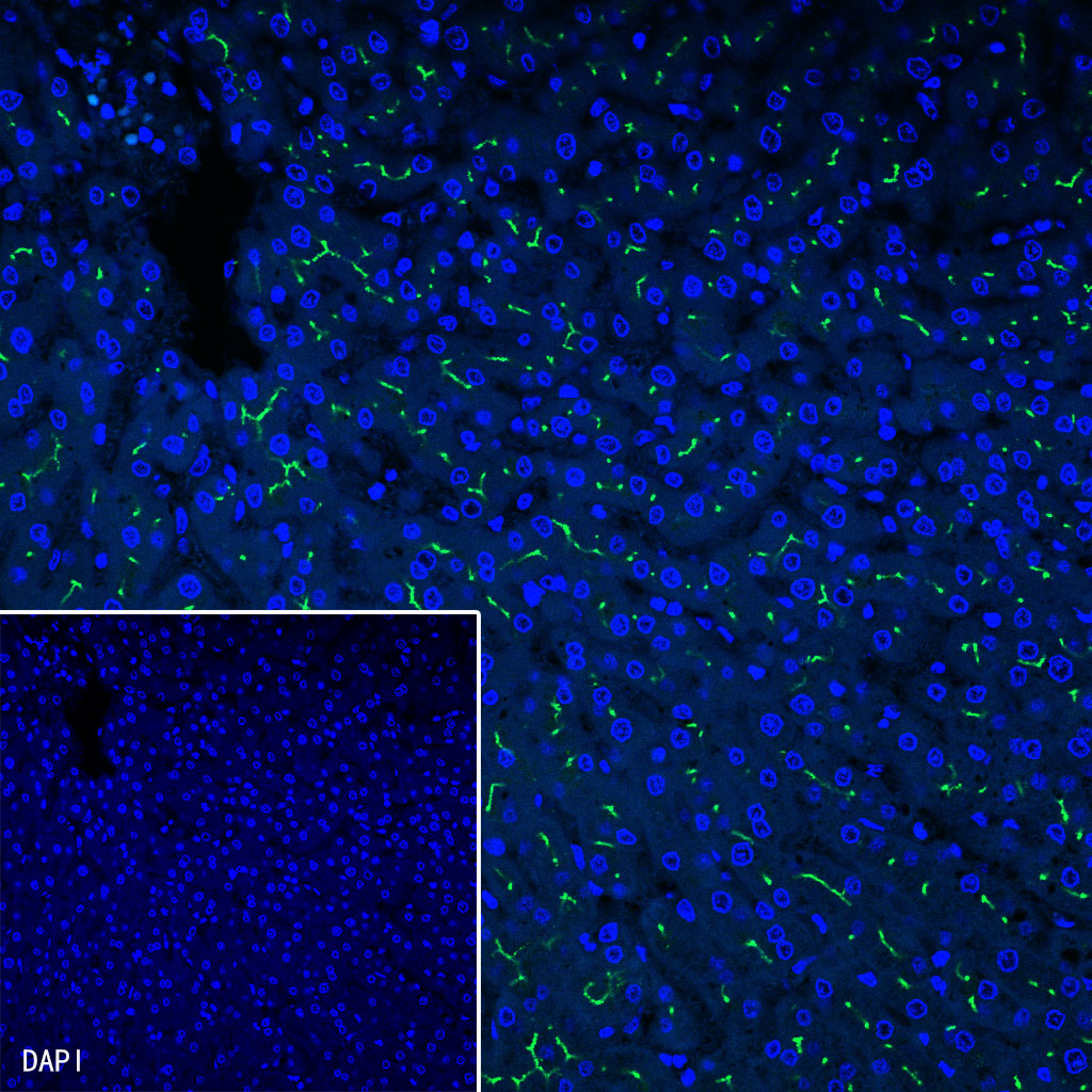 IF shows positive staining in paraffin-embedded human liver . Anti-BSEP antibody was used at 1/1000 dilution (Green) and incubated overnight at 4°C. Goat polyclonal Antibody to Rabbit IgG - H&L (Alexa Fluor® 488) was used as secondary antibody at 1/1000 dilution. Counterstained with DAPI (Blue). Heat mediated antigen retrieval with Tris/EDTA buffer pH9.0 was performed before commencing with IF staining protocol.