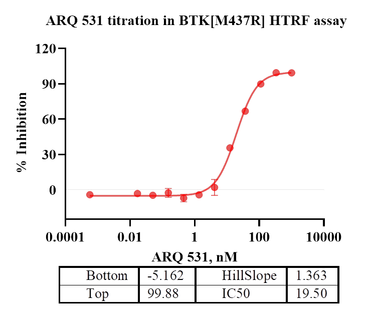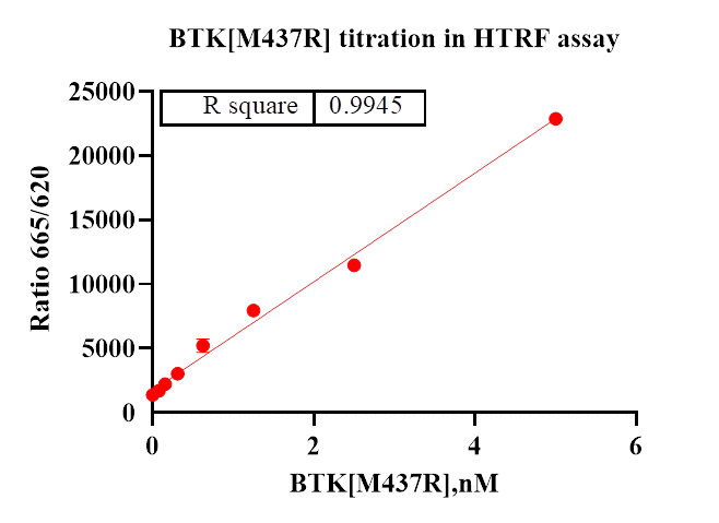 The BTK[M437R] activity was detected using HTRF technology. The reaction was performed by incubating the BTK[M437R] protein, ATP and substrate at 25℃ for 50 min, adding the beads at 25℃ for 60 min, then reading ratio 665/620 with BMG.