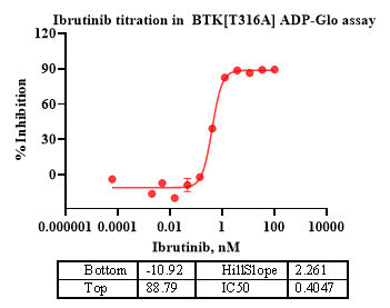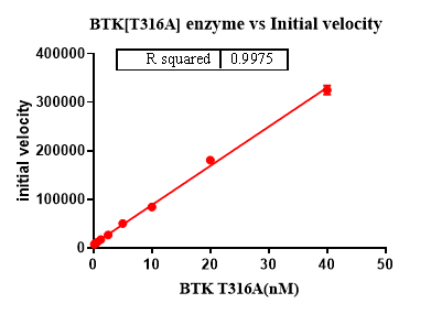 The BTK[T316A] activity was detected using Ultra Luminescence technology. The reaction was performed by incubating the BTK[T316A] protein, ATP and substrate at 25℃ for 120 min, then adding ADP-Glo reagent and reading RLU signal with BMG.