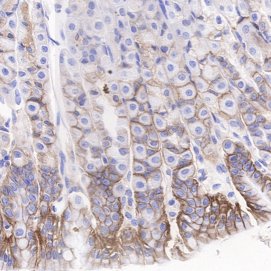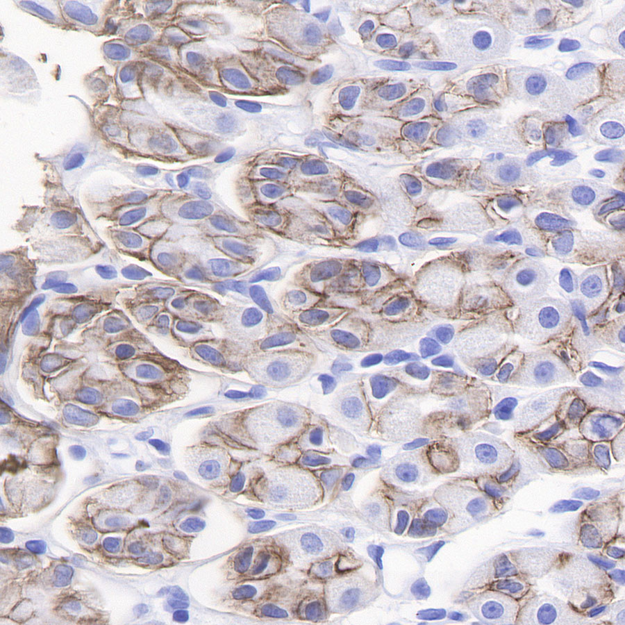 IHC shows positive staining in paraffin-embedded mouse stomach. Anti-CAIX antibody was used at 1/8000 dilution, followed by a HRP Polymer for Mouse & Rabbit IgG (ready to use). Counterstained with hematoxylin. Heat mediated antigen retrieval with Tris/EDTA buffer pH9.0 was performed before commencing with IHC staining protocol.