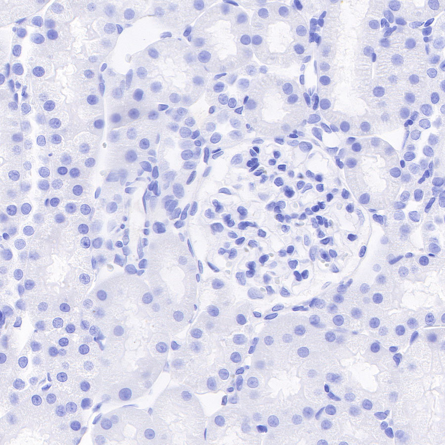 Negative control: IHC shows negative staining in paraffin-embedded rat kidney. Anti-CAIX antibody was used at 1/8000 dilution, followed by a HRP Polymer for Mouse & Rabbit IgG (ready to use). Counterstained with hematoxylin. Heat mediated antigen retrieval with Tris/EDTA buffer pH9.0 was performed before commencing with IHC staining protocol.