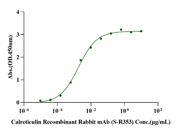 Immobilized CALR/Calreticulin His Tag, Human (Cat. No. UA010689) at 2.0μg/mL (100μL/well) can bind Calreticulin Recombinant Rabbit mAb (S-R353) (Cat. No. S0B0474) with EC50 of 1.37-2.37ng/mL.