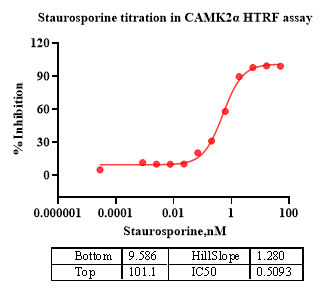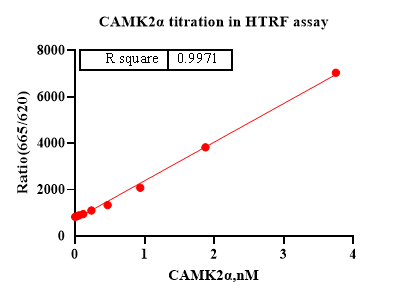 The CaMK2α activity was detected using HTRF technology. The reaction was performed by incubating the CaMK2α protein, ATP and substrate at 25℃ for 60 min, adding the beads at 25℃ for 60 min, then reading ratio 665/620 with BMG.