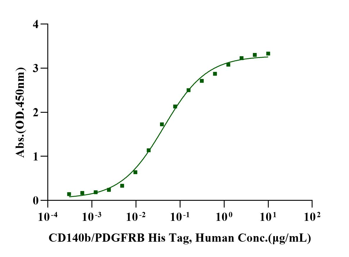 Immobilized PDGF-BB, Human (Cat. No. UA040014) at 0.5μg/mL (100μL/well) can bind CD140b/PDGFRB His Tag, Human (Cat. No. UA010514) with EC50 of 35.14-52.62 ng/mL.