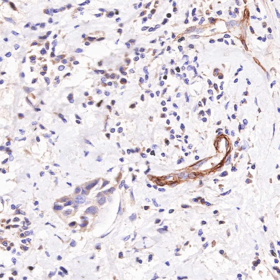 IHC shows positive staining in paraffin-embedded human breast cancer. Anti-CD146 antibody was used at 1/2000 dilution, followed by a HRP Polymer for Mouse & Rabbit IgG (ready to use). Counterstained with hematoxylin. Heat mediated antigen retrieval with Tris/EDTA buffer pH9.0 was performed before commencing with IHC staining protocol.