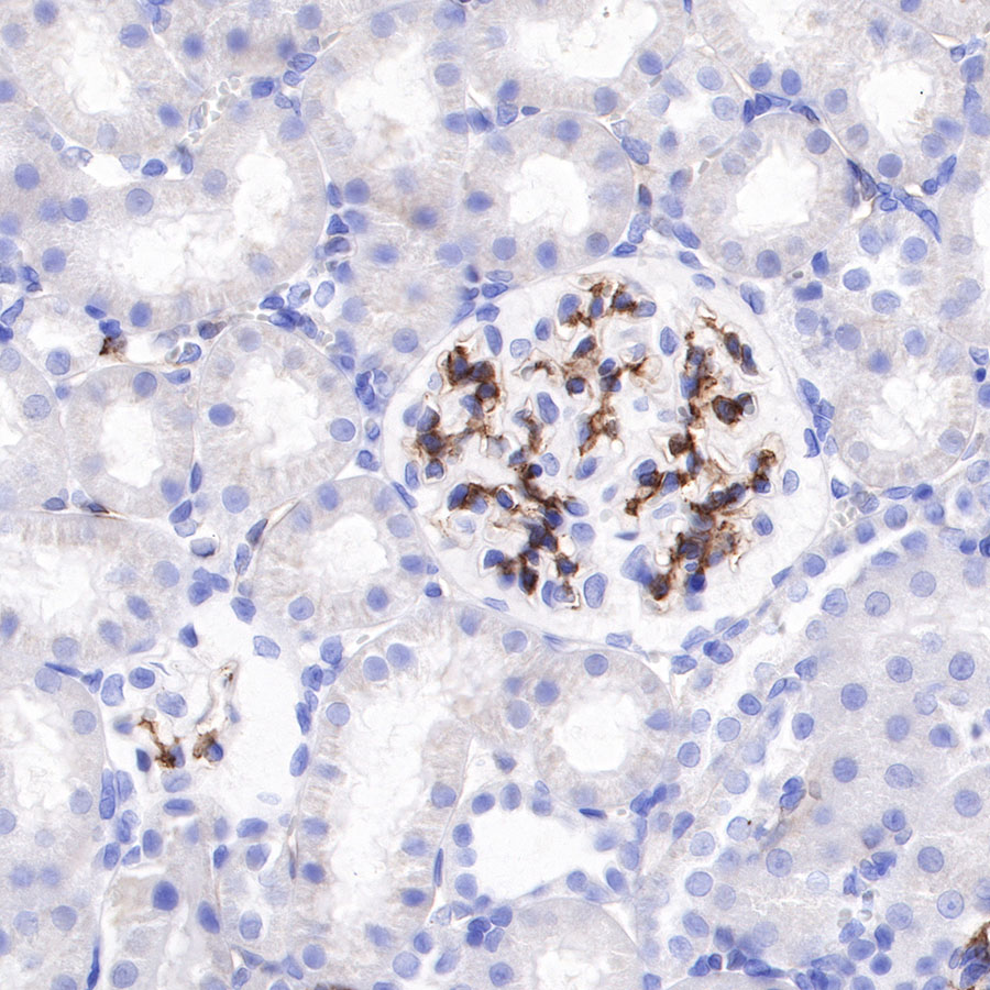 IHC shows positive staining in paraffin-embedded rat kidney. Anti-CD146 antibody was used at 1/2000 dilution, followed by a HRP Polymer for Mouse & Rabbit IgG (ready to use). Counterstained with hematoxylin. Heat mediated antigen retrieval with Tris/EDTA buffer pH9.0 was performed before commencing with IHC staining protocol.