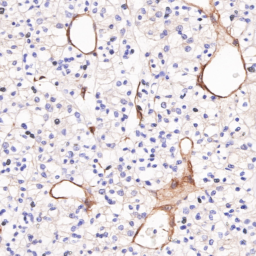 IHC shows positive staining in paraffin-embedded human renal clear cell carcinoma. Anti-CD146 antibody was used at 1/2000 dilution, followed by a HRP Polymer for Mouse & Rabbit IgG (ready to use). Counterstained with hematoxylin. Heat mediated antigen retrieval with Tris/EDTA buffer pH9.0 was performed before commencing with IHC staining protocol.