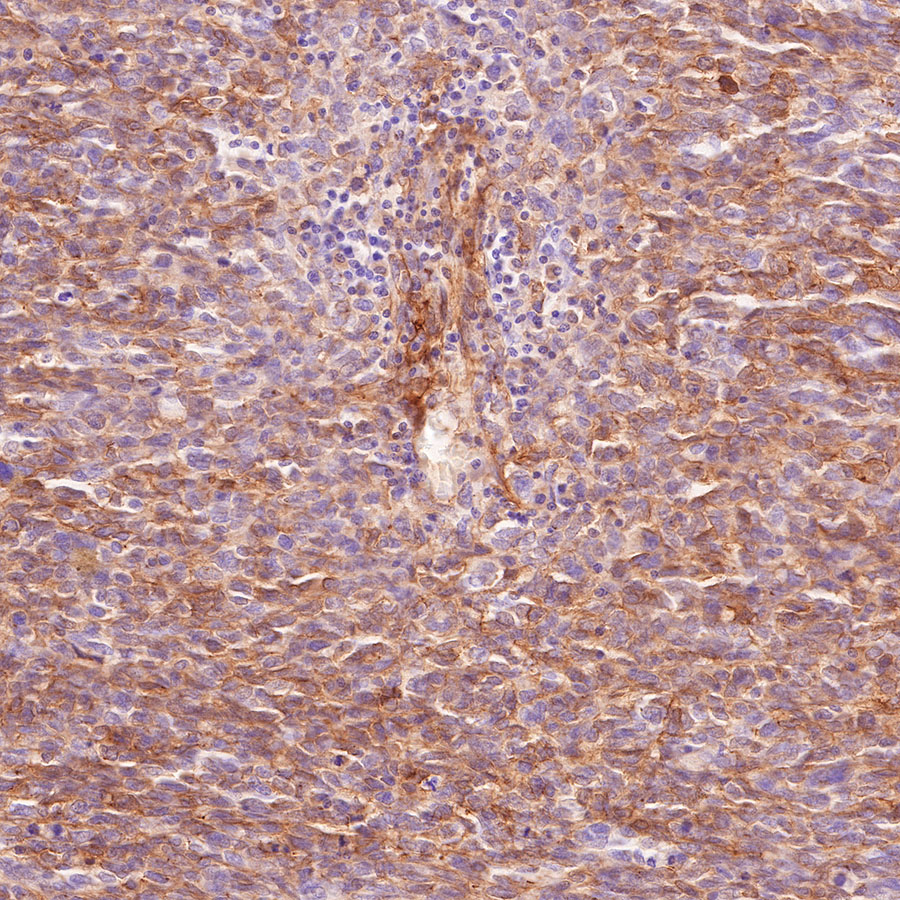 IHC shows positive staining in paraffin-embedded human melanoma. Anti-CD146 antibody was used at 1/1000 dilution, followed by a HRP Polymer for Mouse & Rabbit IgG (ready to use). Counterstained with hematoxylin. Heat mediated antigen retrieval with Tris/EDTA buffer pH9.0 was performed before commencing with IHC staining protocol.