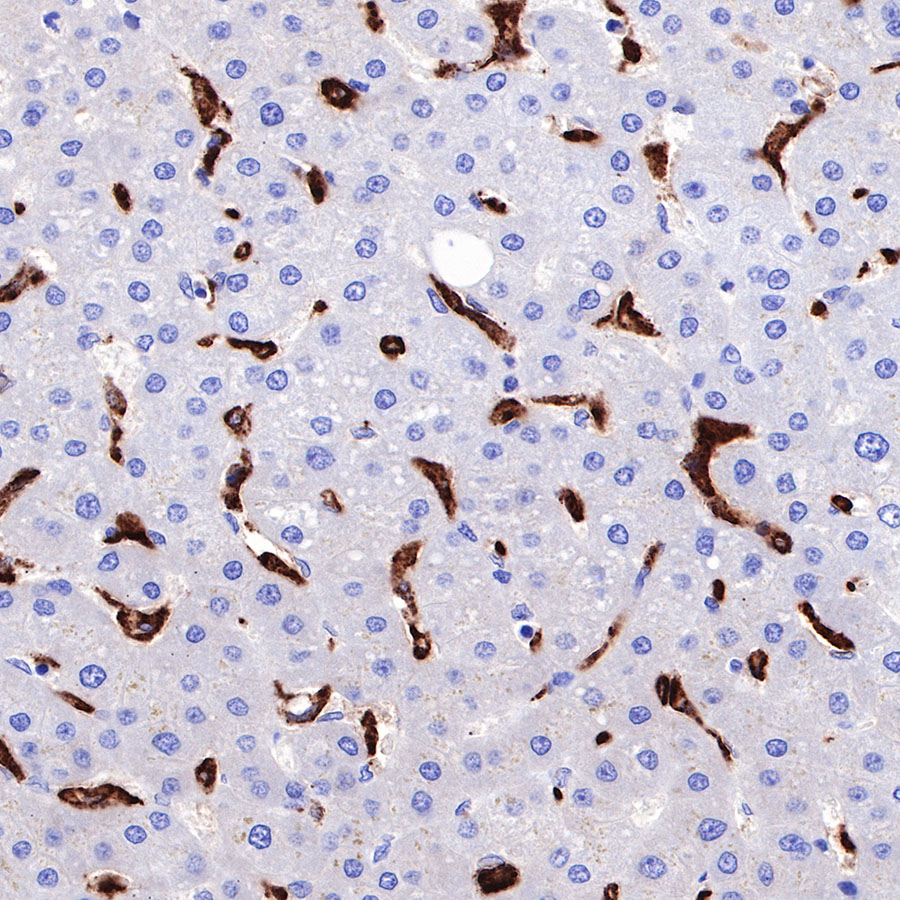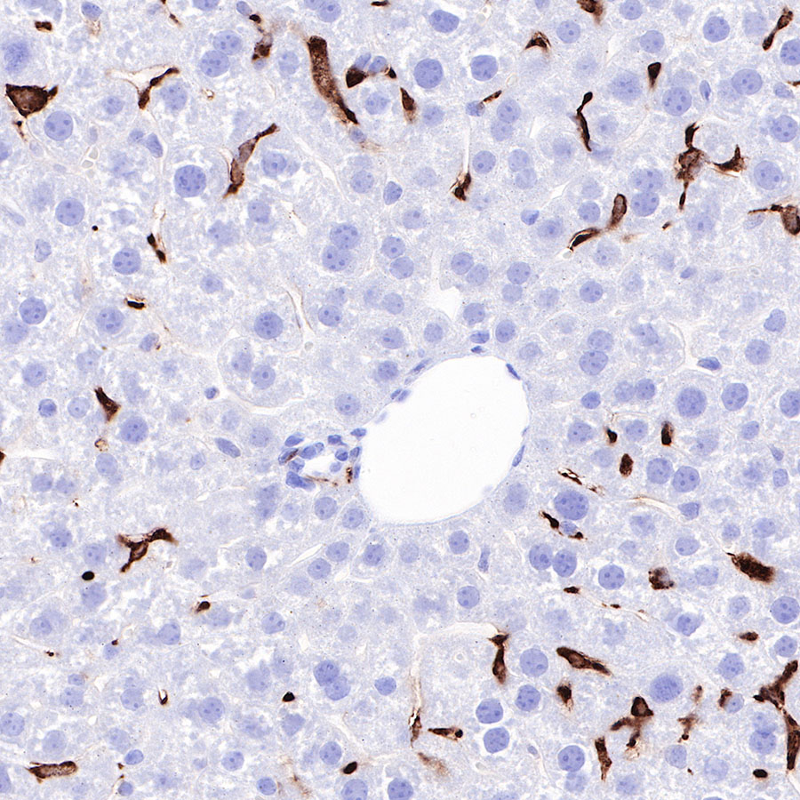 IHC shows positive staining in paraffin-embedded mouse liver. Anti-CD163 antibody was used at 1/1000 dilution, followed by a HRP Polymer for Mouse & Rabbit IgG (ready to use). Counterstained with hematoxylin. Heat mediated antigen retrieval with Tris/EDTA buffer pH9.0 was performed before commencing with IHC staining protocol.