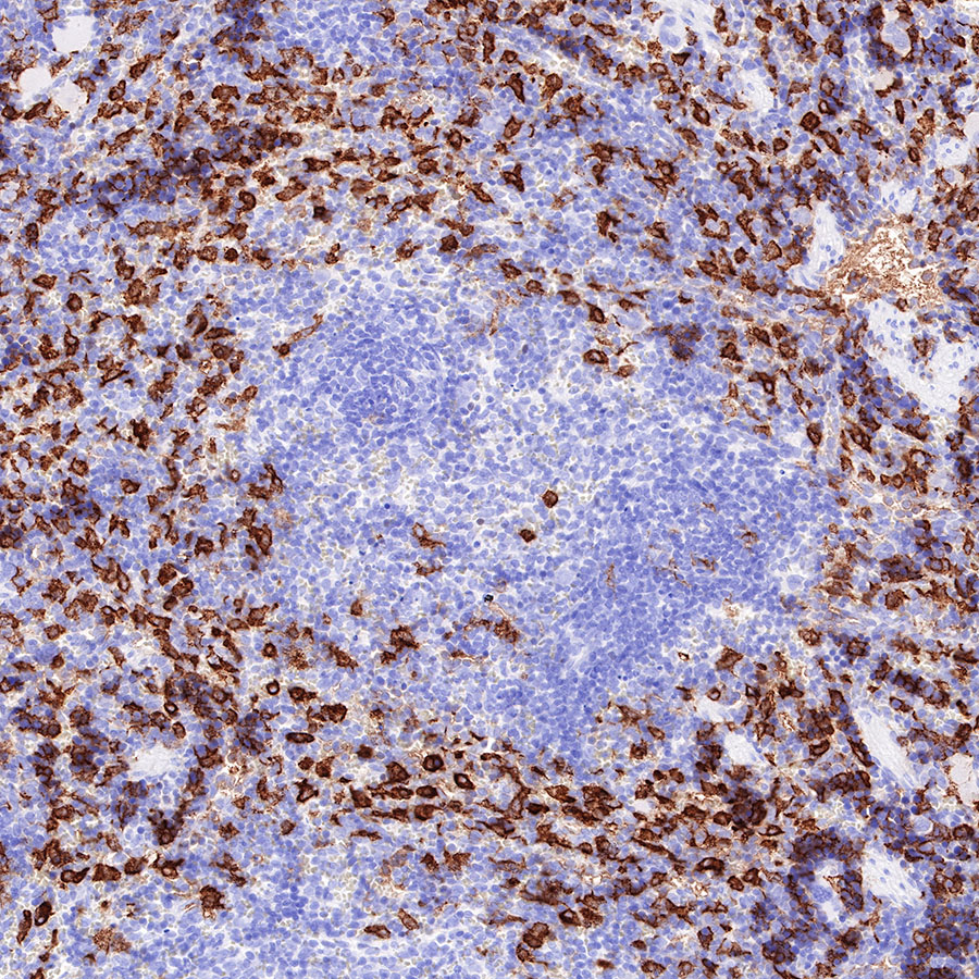 IHC shows positive staining in paraffin-embedded human spleen. Anti-CD163 antibody was used at 1/1000 dilution, followed by a HRP Polymer for Mouse & Rabbit IgG (ready to use). Counterstained with hematoxylin. Heat mediated antigen retrieval with Tris/EDTA buffer pH9.0 was performed before commencing with IHC staining protocol.
